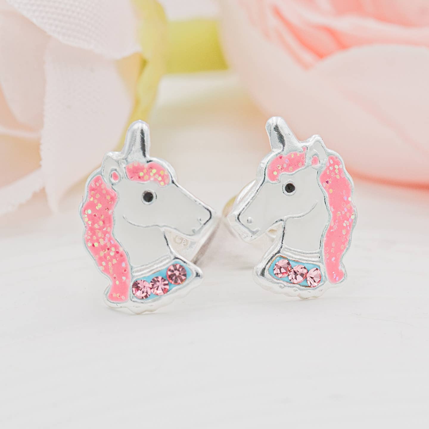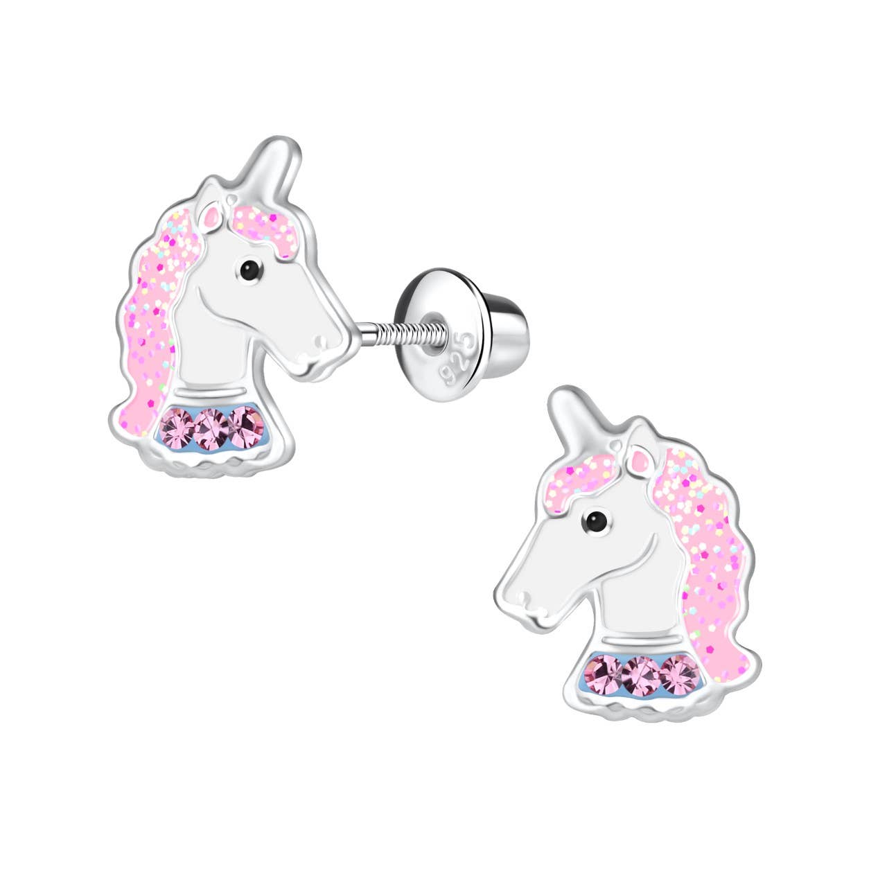 Sterling silver unicorn earrings with pink sparkling CZs and glitter accents make a wonderful gift for babies, toddlers, children or little girls! Earrings include an extra hypo-allergenic, anti-tarnish finish to keep your pieces sparkling beautifully for years to come. đź’— Screw back closure so they don't fall off and get lost đź’— Shortened posts so they won't poke the backs of their little ears đź’— Dimensions 9mm đź’— Presented in a sweet gift box little girls love!Â