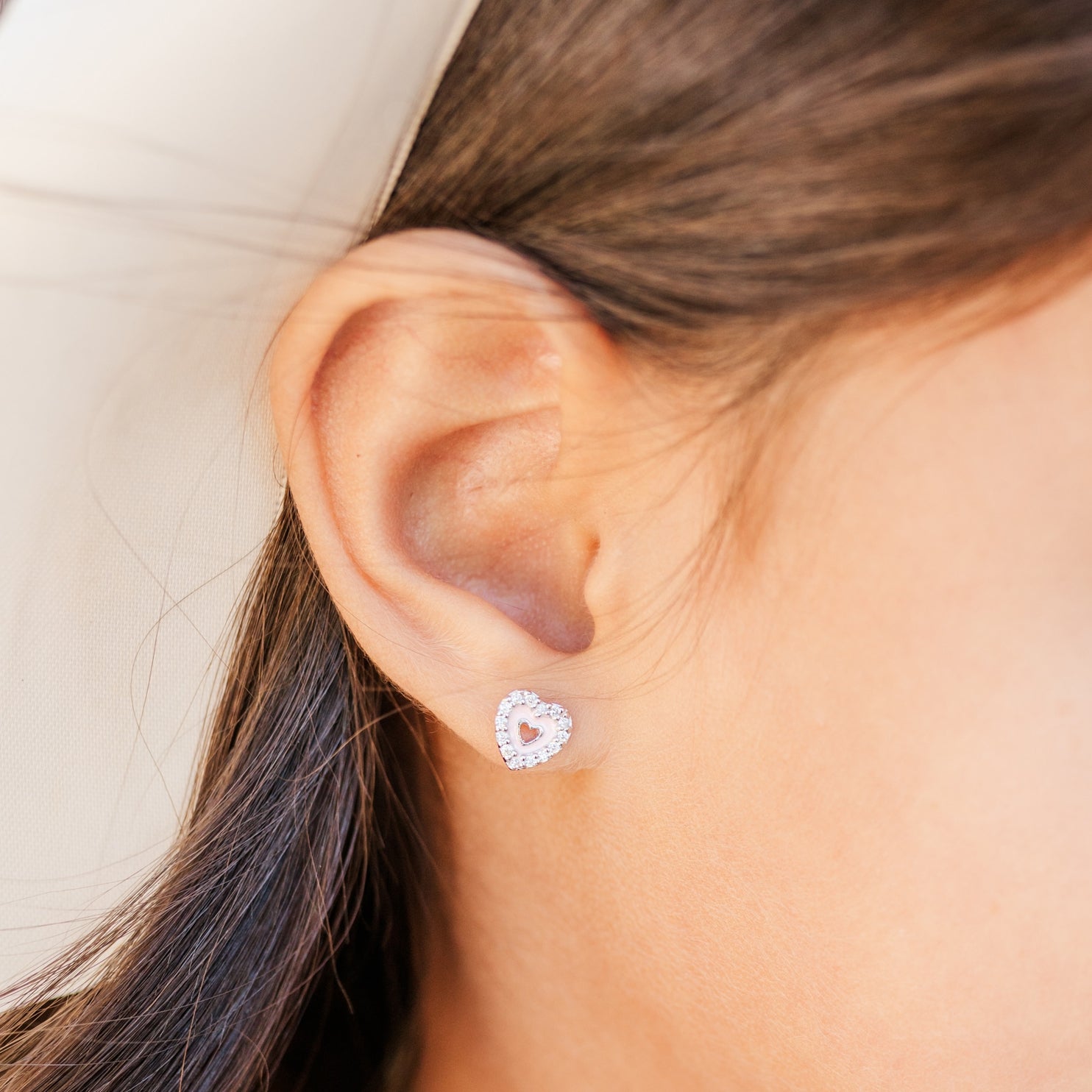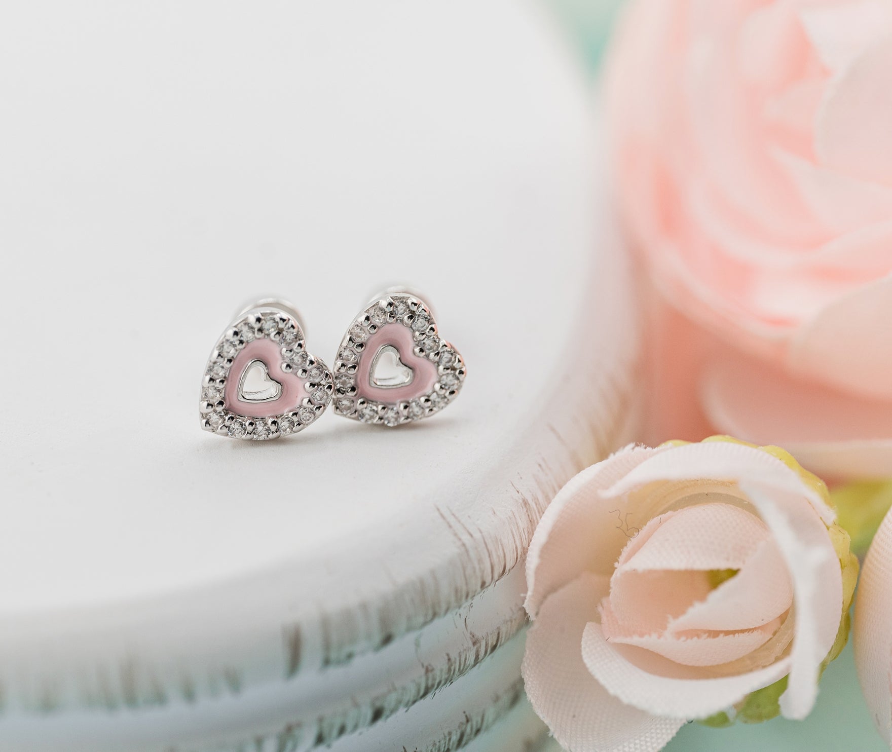 Little girls sterling silver pink heart earrings accented with beautiful sparkling CZs and screw back closure. Gorgeous and dainty making a wonderful gift for flower girls, birthday gift for little girls, and everyday earrings for babies, toddlers or older girls! Great earrings for new pierced ears created with nickel free precious metals so it will not irritate her ears. 🌸Earrings are hypo-allergenic so they will not irritate sensitive ears and have shortened posts for kids so they don't poke the backs of her ears. 🌸These earrings come with safety screw-back closure so they are secure and protect the backs of their little ears. These were created with our original screw back system designed to keep the earrings secure and prevent them from coming off or becoming lost.