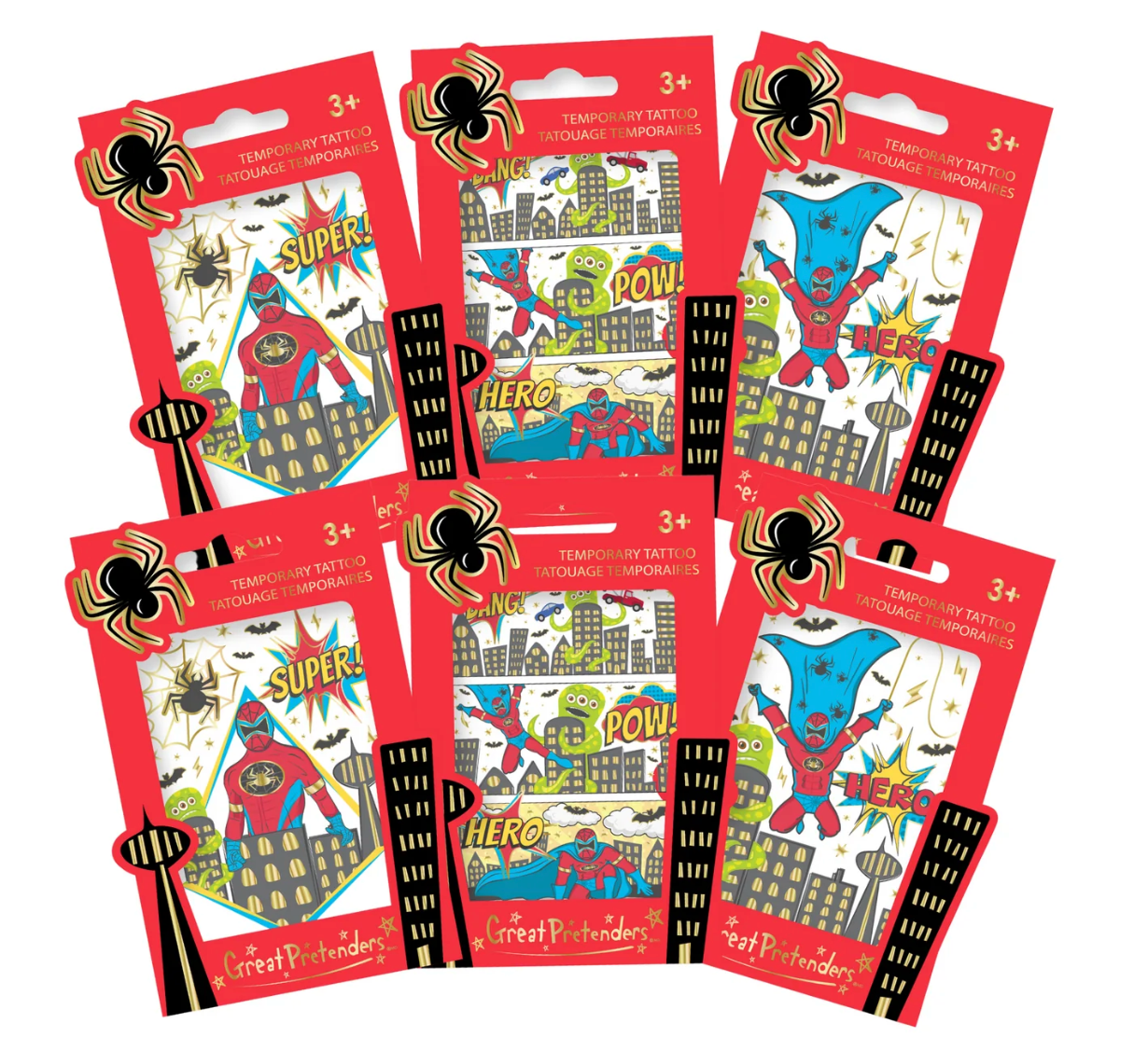 Grab your cape and get ready to save the day with our Superhero Tattoos. Each pack comes with an assortment of three designs, making them the perfect accessory for any young hero!