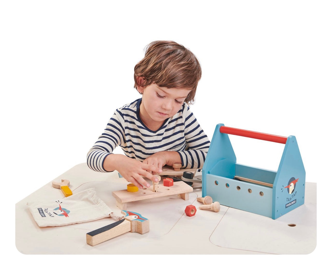 A Tender Leaf Toys branded woodpecker themed tool box filled with everything you need to build something on your own. With two removable lid pieces that turn into screwable plates, and a cloth printed bag to pack away after play, this set includes a woodpecker hammer, a pair of pliers, a screwdriver, a spanner, 2 screws, 2 bolts, 2 planks, 4 nuts, and 4 pegs. We have even included a chalkboard on one end of the box to record your inventions.
