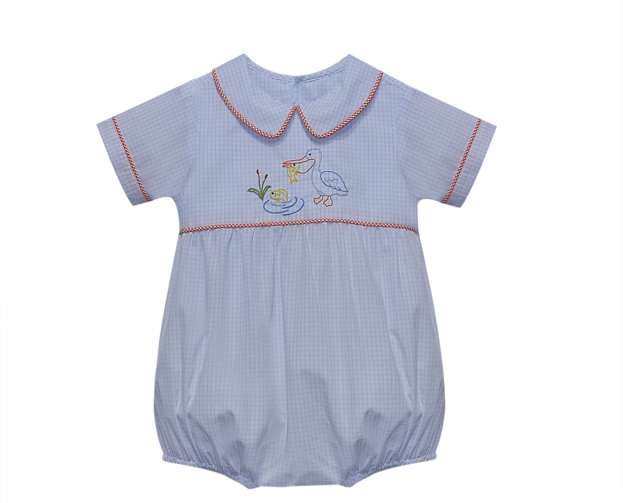 This charming boys bubble features a classic blue plaid design accented with contrasting red plaid piping along the seams. The chest showcases detailed stitched pelican embroidery, adding a coastal-inspired touch that elevates the piece. Perfect for layering or wearing solo, this bubble combines timeless plaid styling with thoughtful craftsmanship. Ideal for active boys who appreciate quality construction and distinctive design details.
