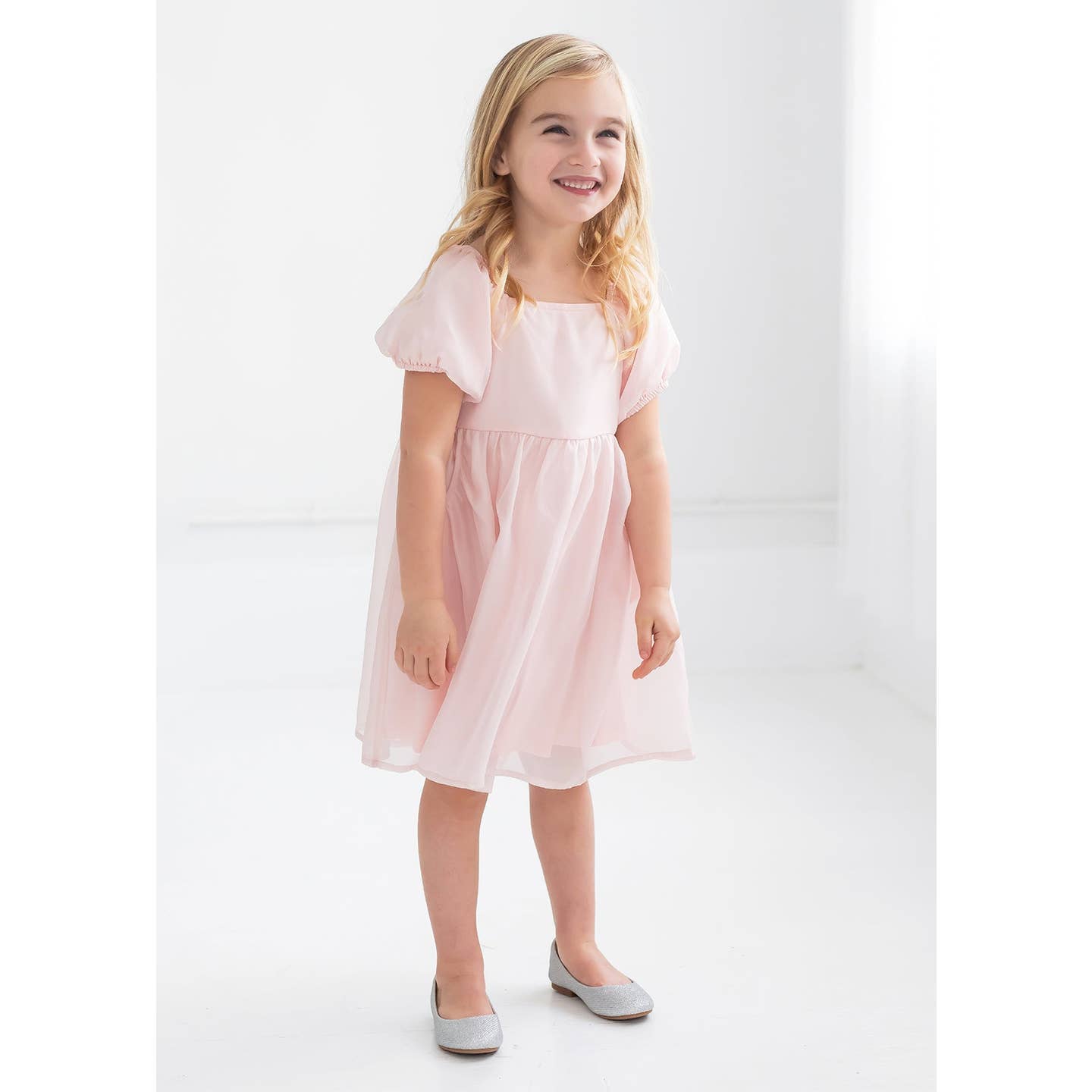 This enchanting girl's dress features a delicate, airy fabric in a soft pink hue. The puff sleeves and gathered waist create a charming silhouette, perfect for special occasions. The lightweight material adds a touch of elegance, while the flowing design ensures comfort. Fabric Care 85% POLYESTER 15% NYLON Machine Wash Cold | Line Dry Do Not Bleach