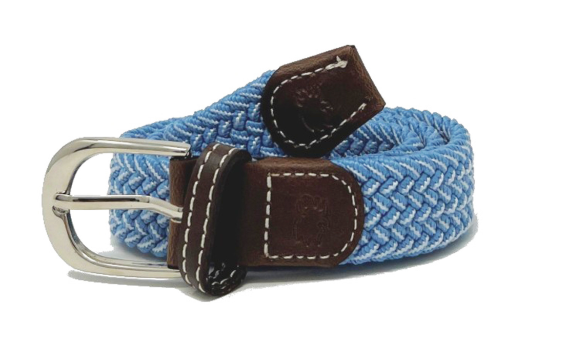 The Lil' Newport kid's herringbone woven stretch belt. Carolina blue and white belt with a rounded buckle and dark brown leather finish stamped with the Roostas logo. An adjustable clasp goes through the woven belt, allowing for adaptable sizing. Designed for comfort both on and off the course.