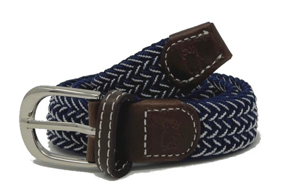 The Lil' Ponte Vedra kid's herringbone woven stretch belt. Navy and gray belt with a rounded buckle and dark brown leather finish stamped with the Roostas logo. An adjustable clasp goes through the woven belt, allowing for adaptable sizing. Designed for comfort both on and off the course.