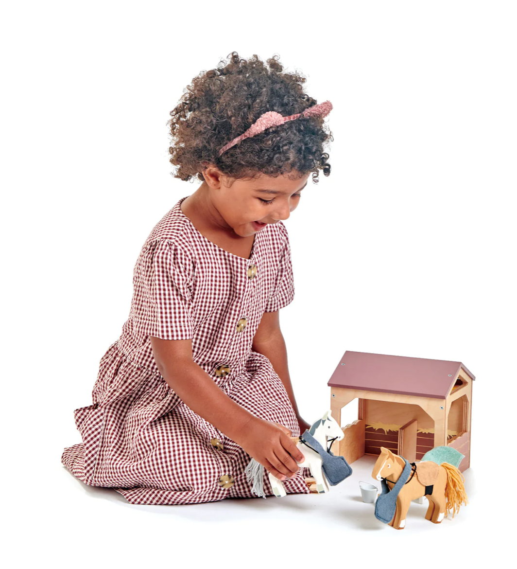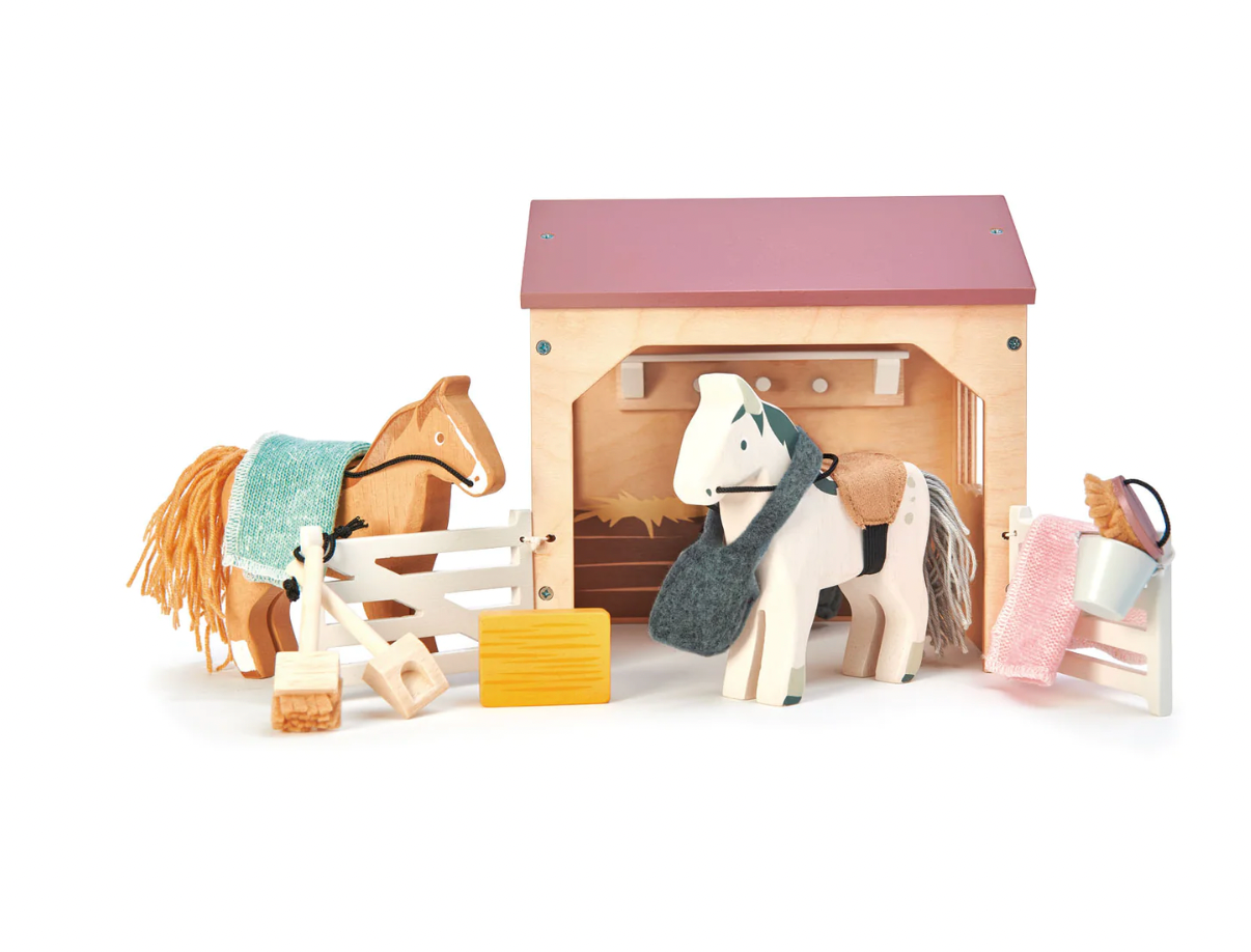 Feed the ponies with a bale of hay and a nose bag. Keep it all neat and tidy with the bucket, spade and broom, which can be hung up on some hooks on the inside wall.