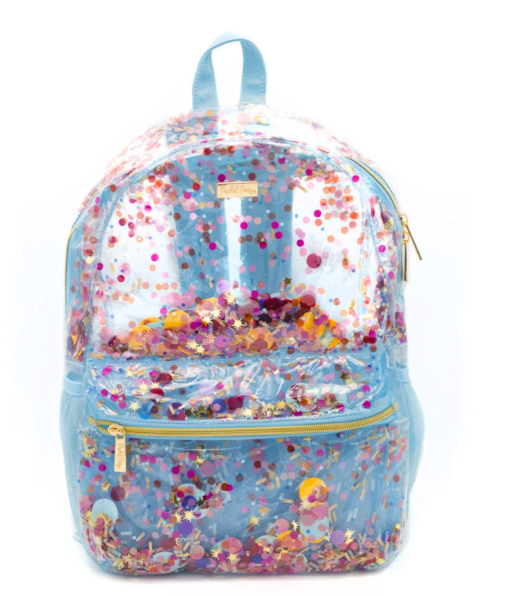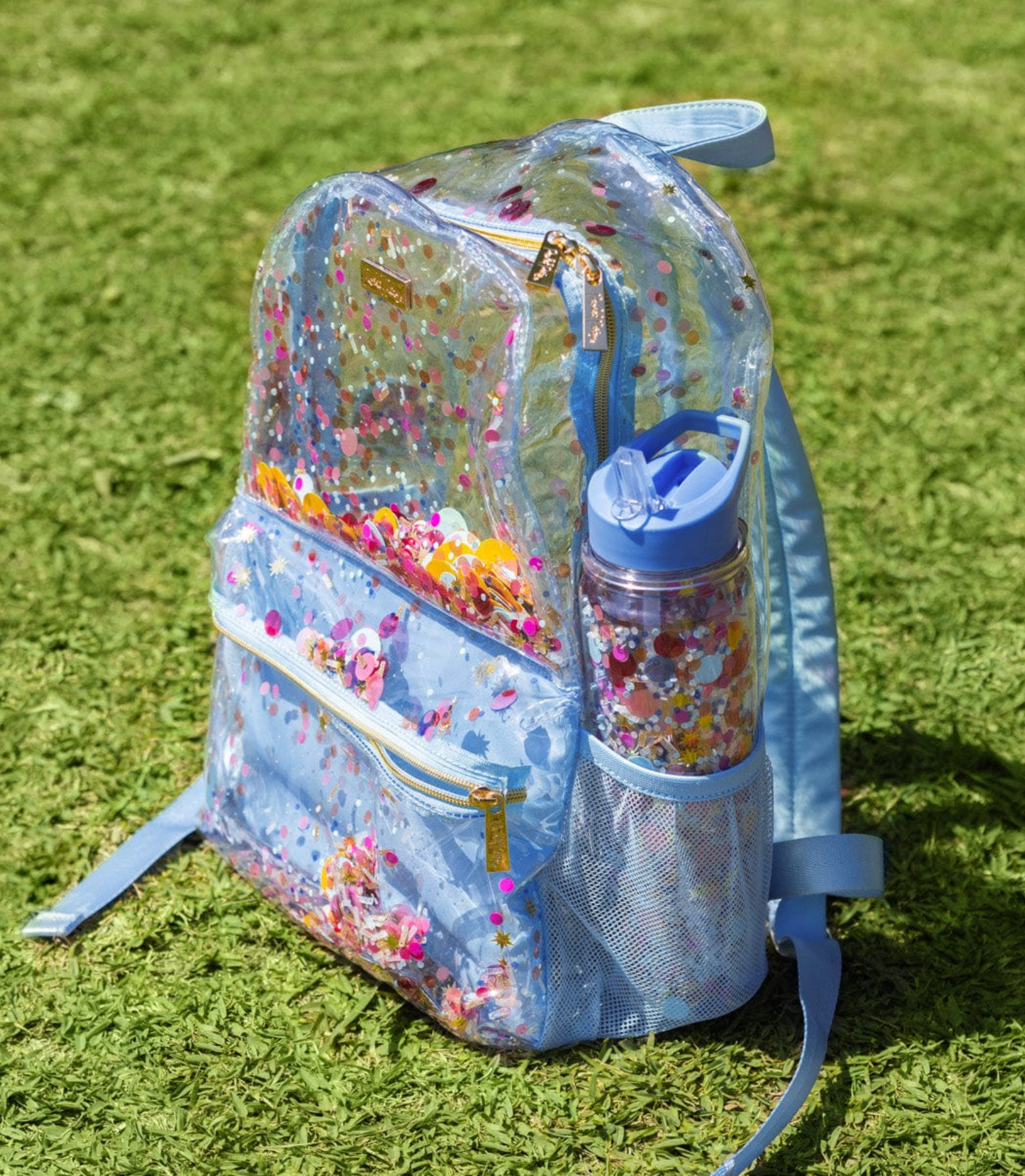 - Clear vinyl with trapped Celebrate Every Day confetti backpack and front pocket