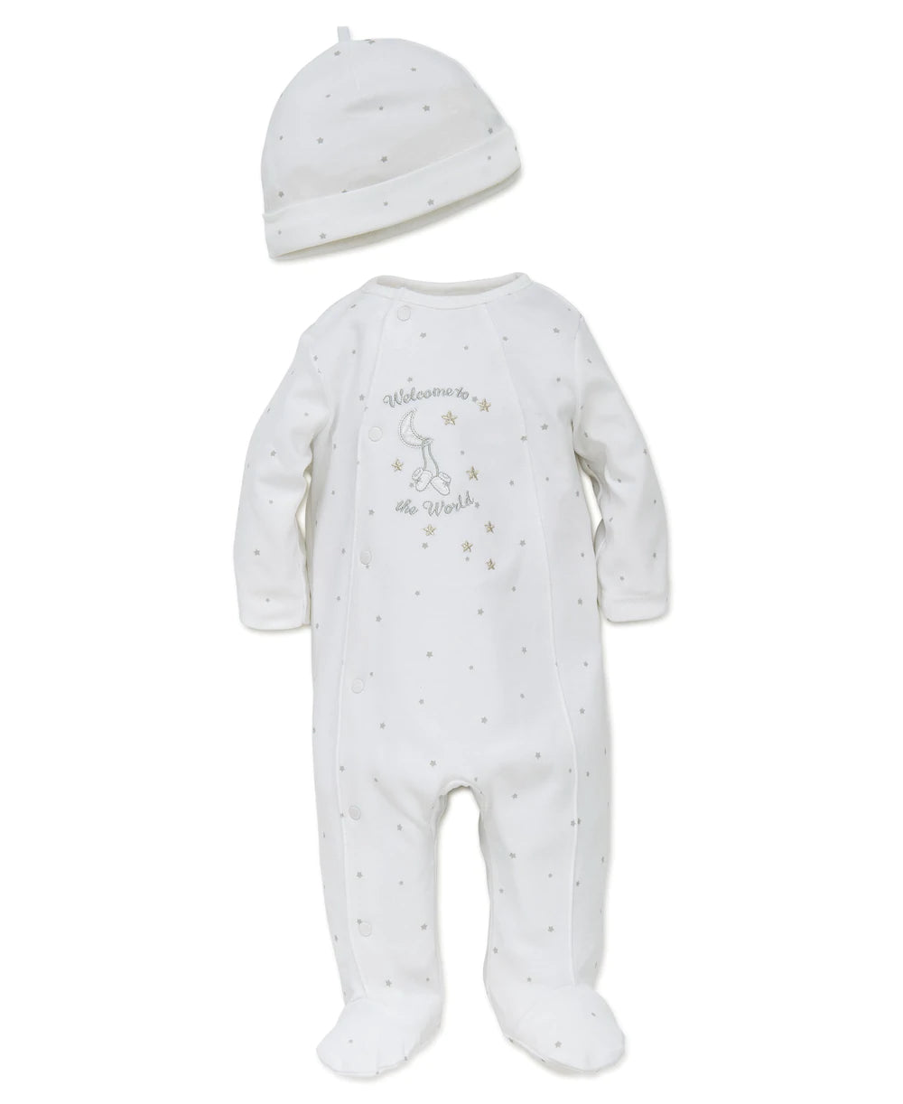 - Welcome your newborn baby to the world with this angelic sleeper specially made for baby's first months. This embroidered footie comes crafted in fine cotton with a full snap front.