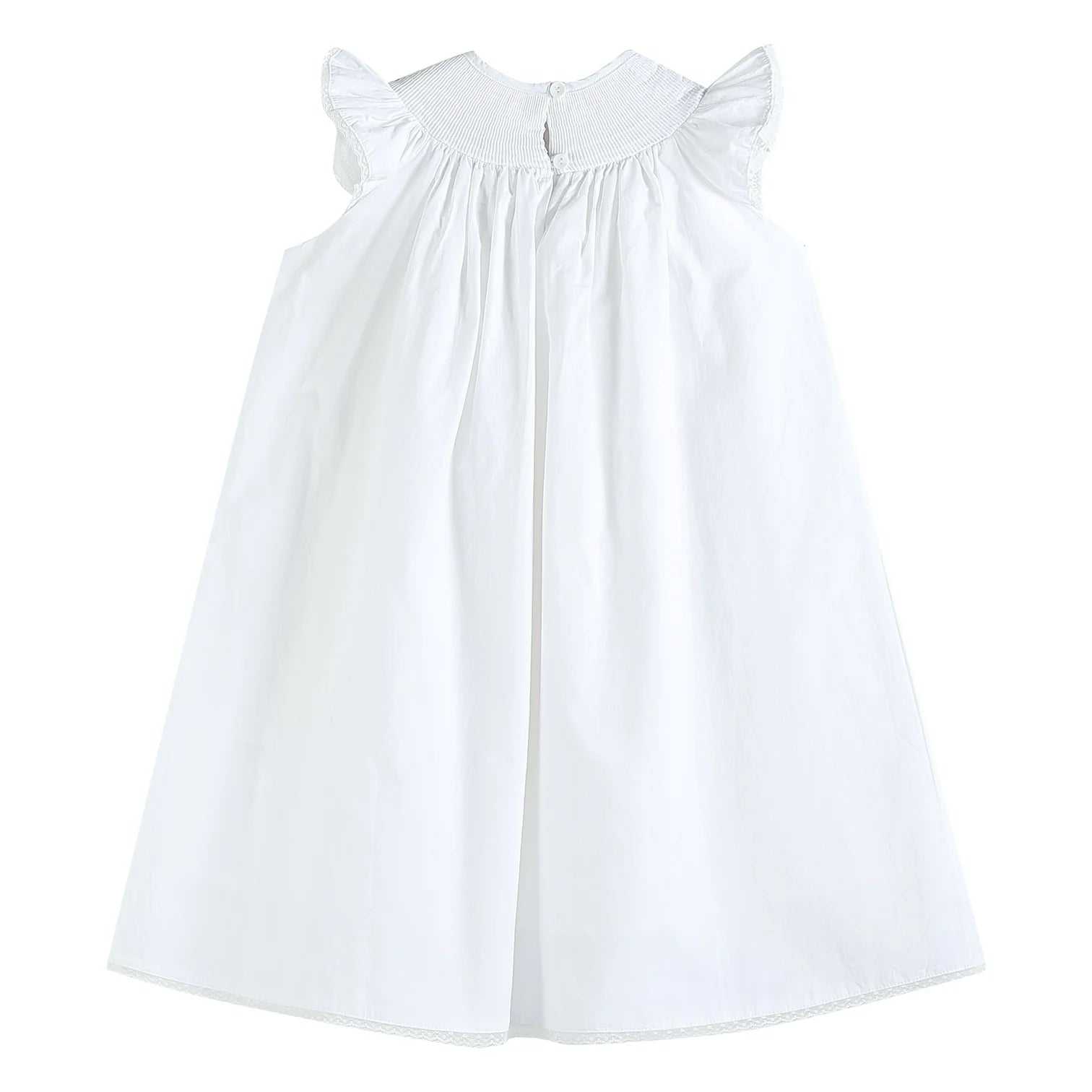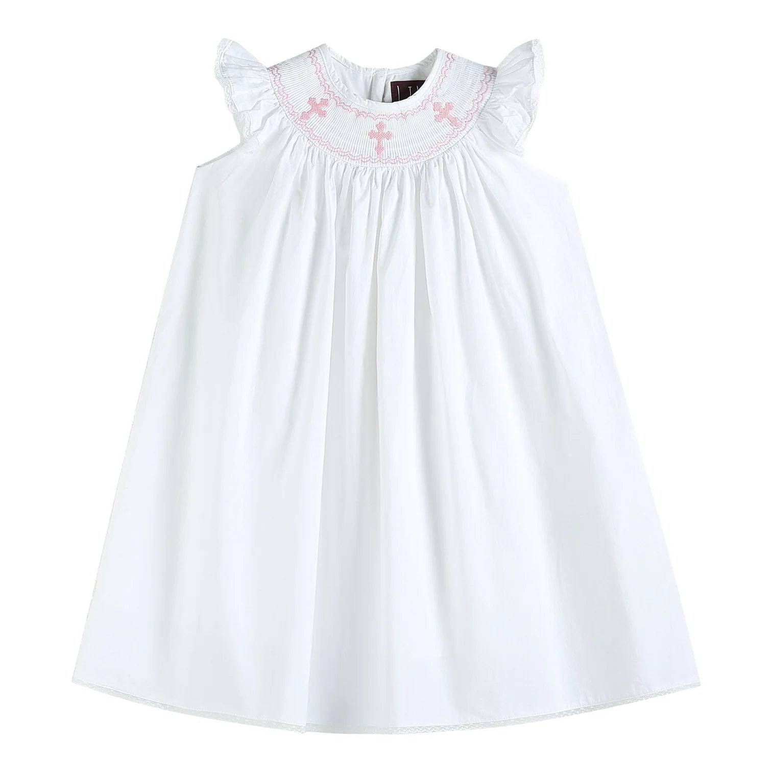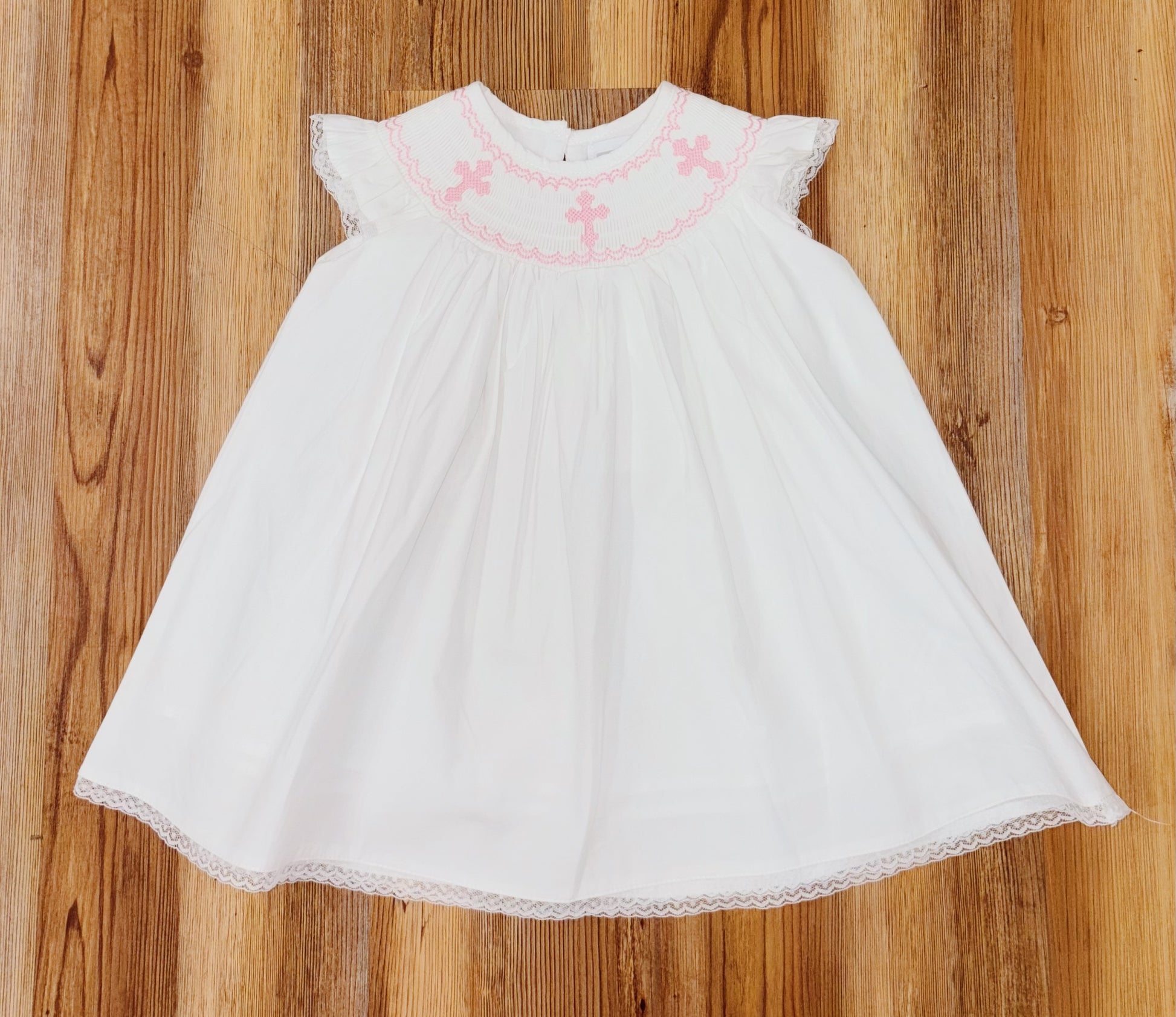 This sweet White and Pink Crosses Smocked Bishop Dress is a timeless classic for little girls. Featuring delicate smocking with embroidered pink crosses and a traditional bishop silhouette, it’s perfect for Easter, church, and special occasions. Made from lightweight 100% cotton, it keeps her cool and comfortable all day.