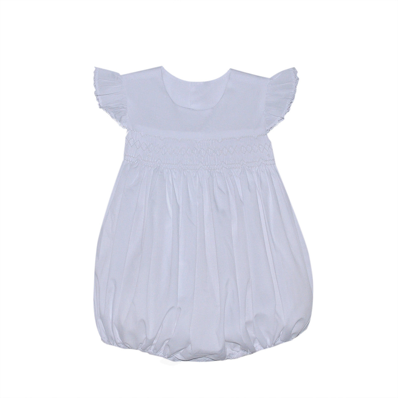 This white smocked bubble features flutter sleeves, creating a charming and classic look. Perfect for any occasion, the smocked design provides a comfortable fit for your child while the flutter sleeves add a touch of elegance. Crafted with high-quality materials, this bubble will keep your child looking adorable and feeling comfortable all day.
