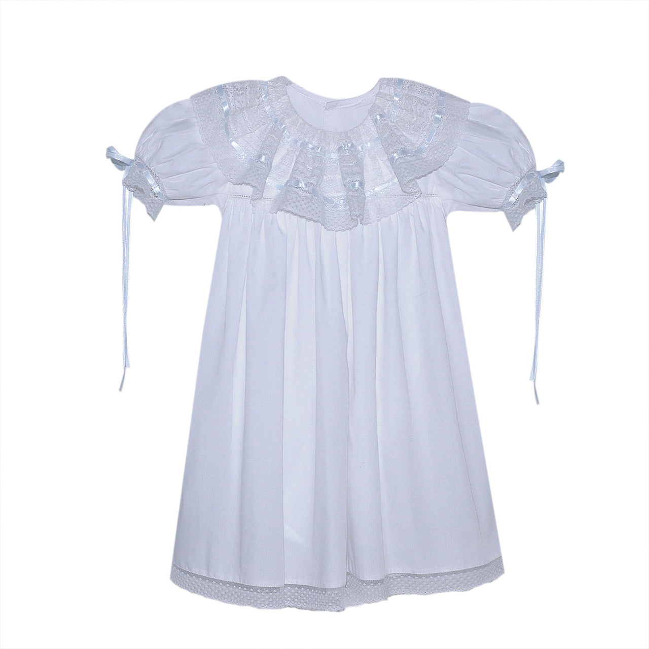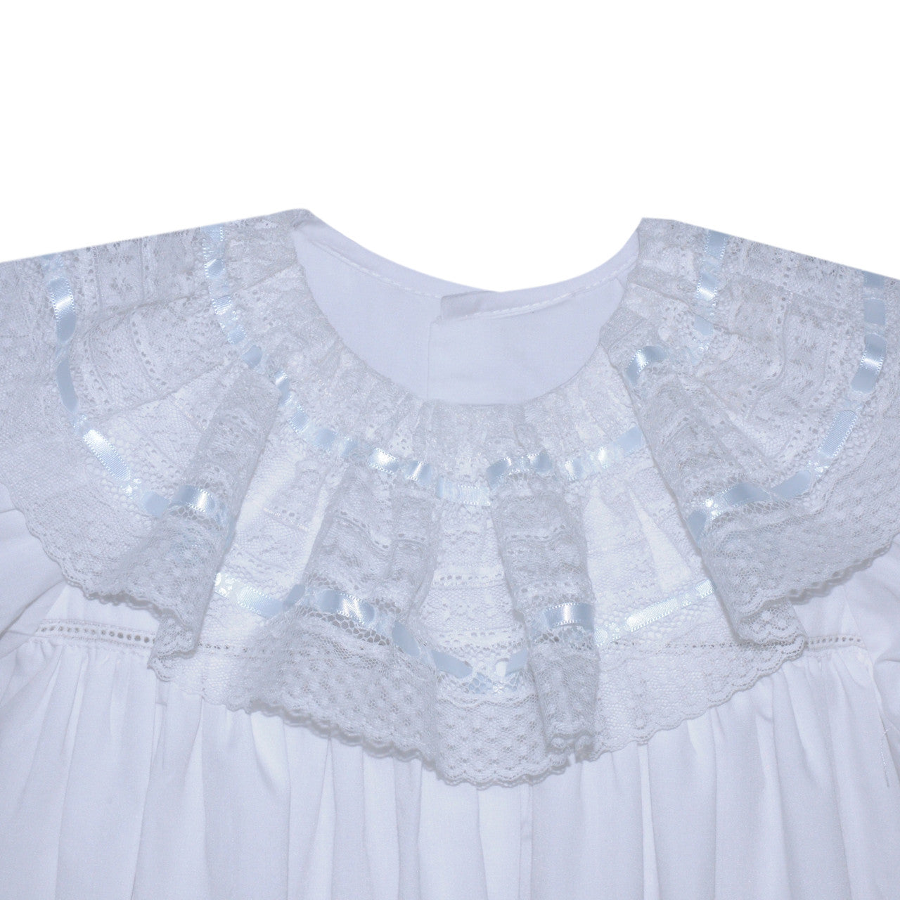 This white lace dress features intricate blue lace, perfect for the little girl in your life. This heirloom piece is not only beautiful, but also durable and timeless. A perfect addition to any wardrobe.