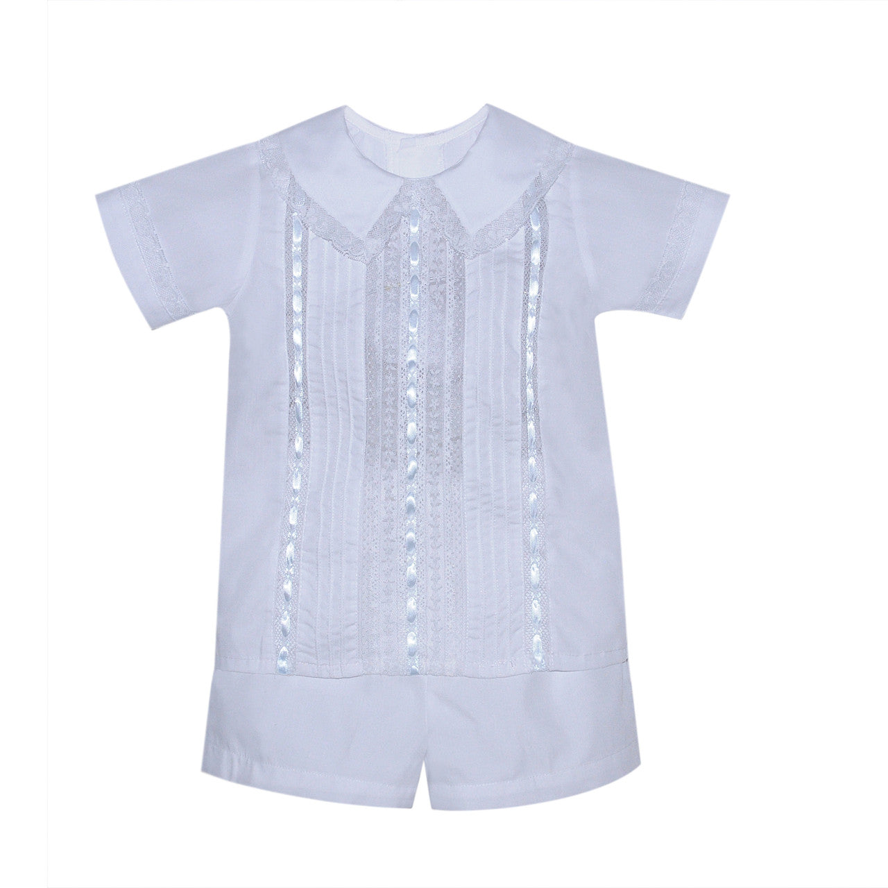 This boys' white lace shorts set features a stylish collar design, perfect for any formal occasion. The delicate lace adds a touch of sophistication, while the lightweight material ensures comfort for all-day wear. Dress your little one in this set for a classic and polished look.