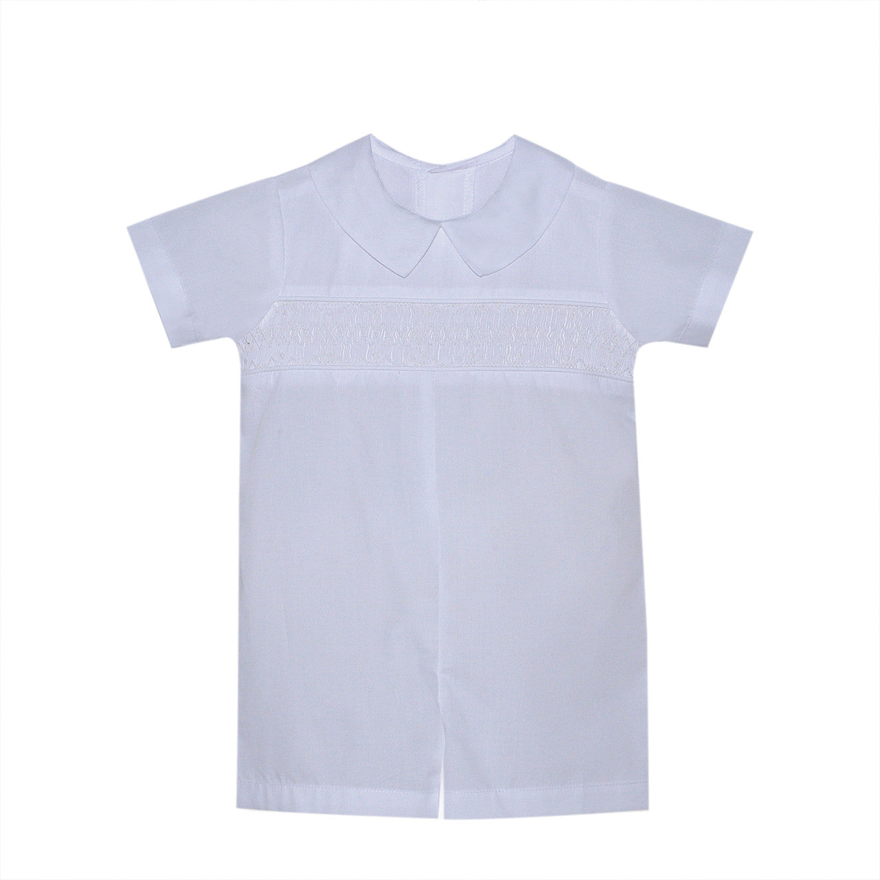 Introducing the perfect addition to your little one's wardrobe - our boy's white smocked shortall romper! Made with high-quality materials and expertly crafted, this romper offers both style and comfort. The smocked design adds a touch of elegance, while the shortall style allows for easy movement and play. Made for little boys, but loved by parents everywhere.