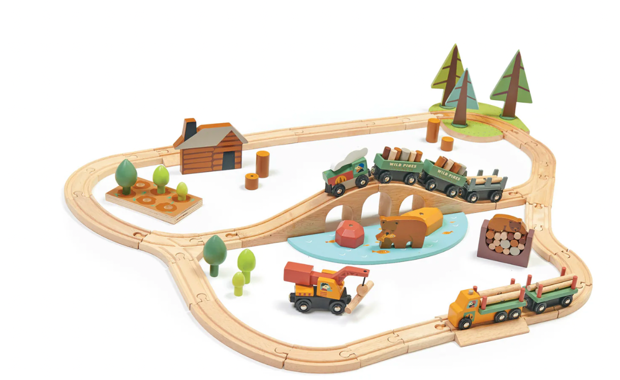 Included in this lumberjack style set is a log pile to hold the logs with a sleeping bear, a lake with 2 magnetized boulders and big bear, and a part that has 3 big fir trees that will block the track unless they are rotated out of the way! 4 cut timber logs and a tree nursery with
